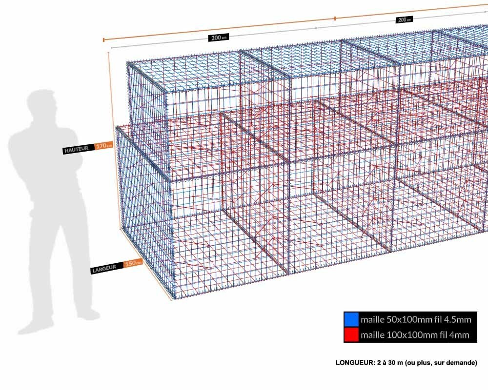 Gabions de qualité professionnelle, pour soutènement de talus avec surcharge. Hauteur 170 cm, longueur 2 m