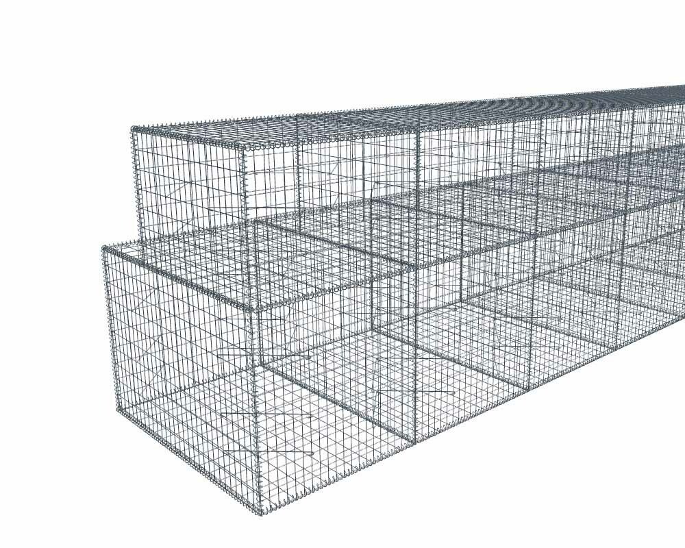Il n'y a pas de doublement de cloisons. Seulement une cloison interne tous les mètres. Recoupe aisée avec une disqueuse ou une pince coupe-boulon. Ces gabions peuvent être superposés. Dans le cas de plusieurs rangs superposés, le couvercle du 1er rang servira de fond pour le 2eme rang, etc...