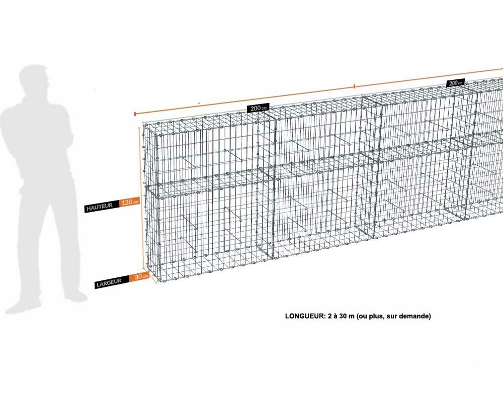 Kit gabion 120cm (H) x 30cm (L), pour clôture, assemblage agrafes, mailles 5 x 10 cm en fils de 4,5 mm sur les faces visibles. Mailles 10 x 10 cm en fils de 4 mm sur les faces invisibles .Kit de 18 m de longueur. Ces gabions sont livrés complets, sans les pierres, et à assembler.