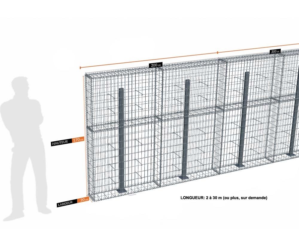 Kit gabion 170cm (H) x 20cm (L), pour clôture, assemblage spirales, mailles 5 x 10 cm, avec poteaux raidisseurs à visser. Kit de 18 m de longueur. Ces gabions sont livrés complets, sans les pierres, et à assembler. Mailles de 5 cm x 10 cm en fils de 4,5 mm sur les faces visibles. Mailles de 10 cm x 10 cm en fils de 4 mm sur les faces invisibles.
