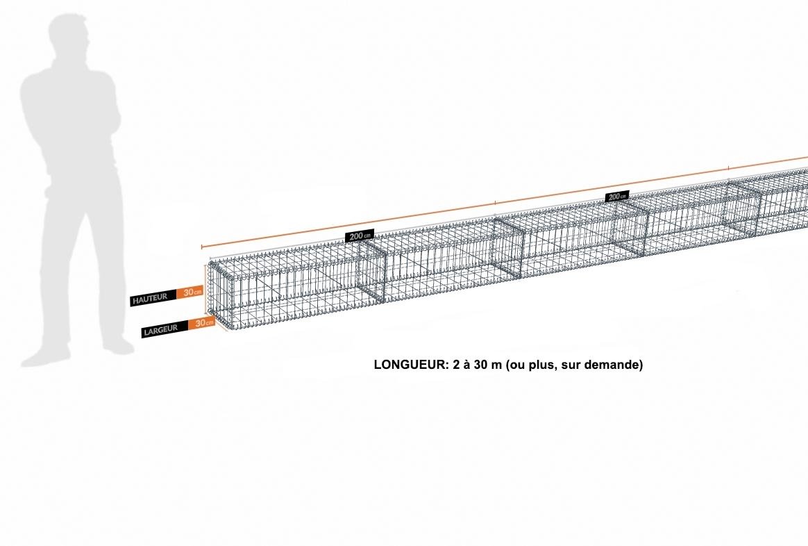 Kit gabion 30cm (H) x 30cm (L), pour clôture, assemblage spirales, mailles 5 x 10 cm en fils de 4,5 mm sur les faces visibles. Mailles 10 x 10 cm en fils de 4 mm sur les faces invisibles .Kit de 20 m de longueur. Ces gabions sont livrés complets, sans les pierres, et à assembler.