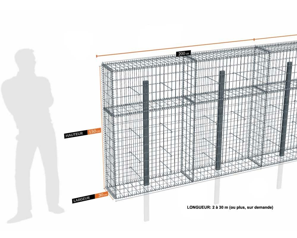 Kit gabion 150cm (H) x 30cm (L), pour clôture, assemblage spirales, mailles 5 x 10 cm, avec poteaux raidisseurs à visser. Kit de 22 m de longueur. Ces gabions sont livrés complets, sans les pierres, et à assembler. Mailles de 5 cm x 10 cm en fils de 4,5 mm sur les faces visibles. Mailles de 10 cm x 10 cm en fils de 4 mm sur les faces invisibles.