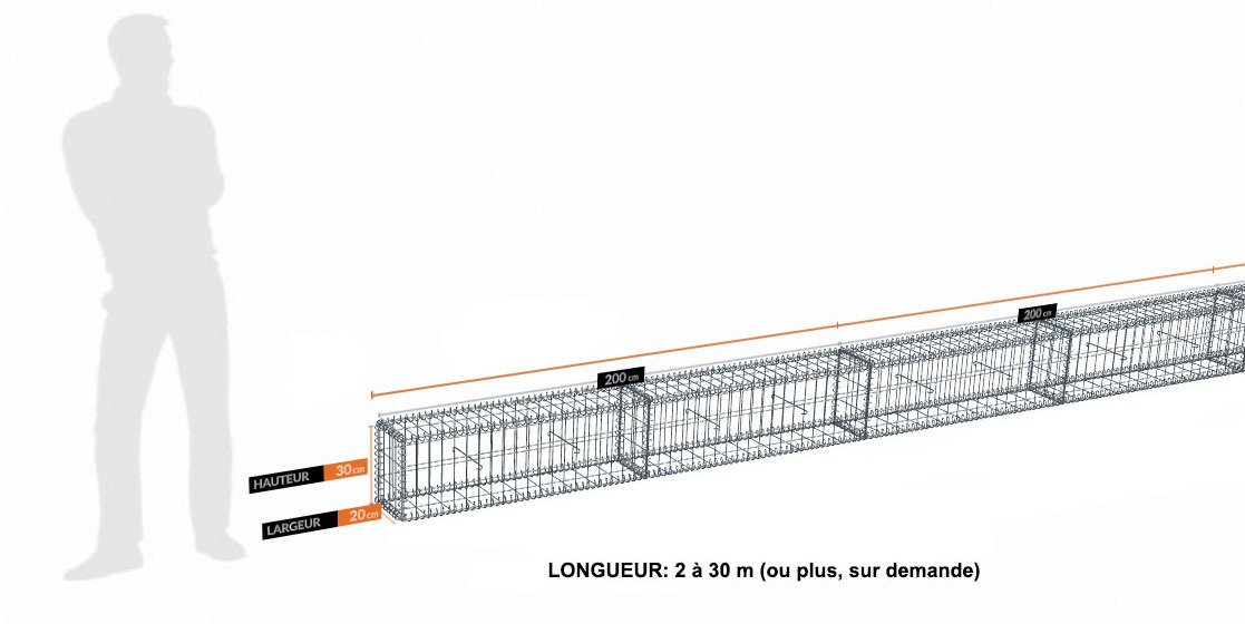 Ces gabions sont des modules de 2 ml, composés de panneaux de 2 m de long. Pour les kits de moins de 6 m de longueur, les côtés sont composés de panneaux de 1 m de longueur.