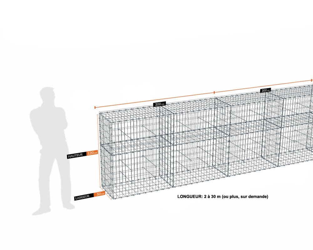 Kit gabion 120cm (H) x 50cm (L), pour clôture, assemblage agrafes, mailles 5 x 10 cm en fils de 4,5 mm sur les faces visibles. Mailles 10 x 10 cm en fils de 4 mm sur les faces invisibles .Kit de 26 m de longueur. Ces gabions sont livrés complets, sans les pierres, et à assembler.