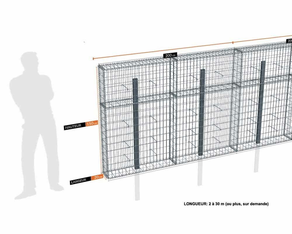 Pour les gabions clôture de 20 cm de largeur et d'une hauteur égale ou supérieure à 1 m, ainsi que pour tous les gabions clôture de largeur 30 cm et d'une hauteur égale ou supérieure à 1.20 m, il est impératif de mettre en place des poteaux raidisseurs ( à sceller ou à visser). Cela évitera tout risque de basculement accidentel. Si vous disposez déjà de poteaux raidisseurs, vous pouvez commander les kits sans poteaux.