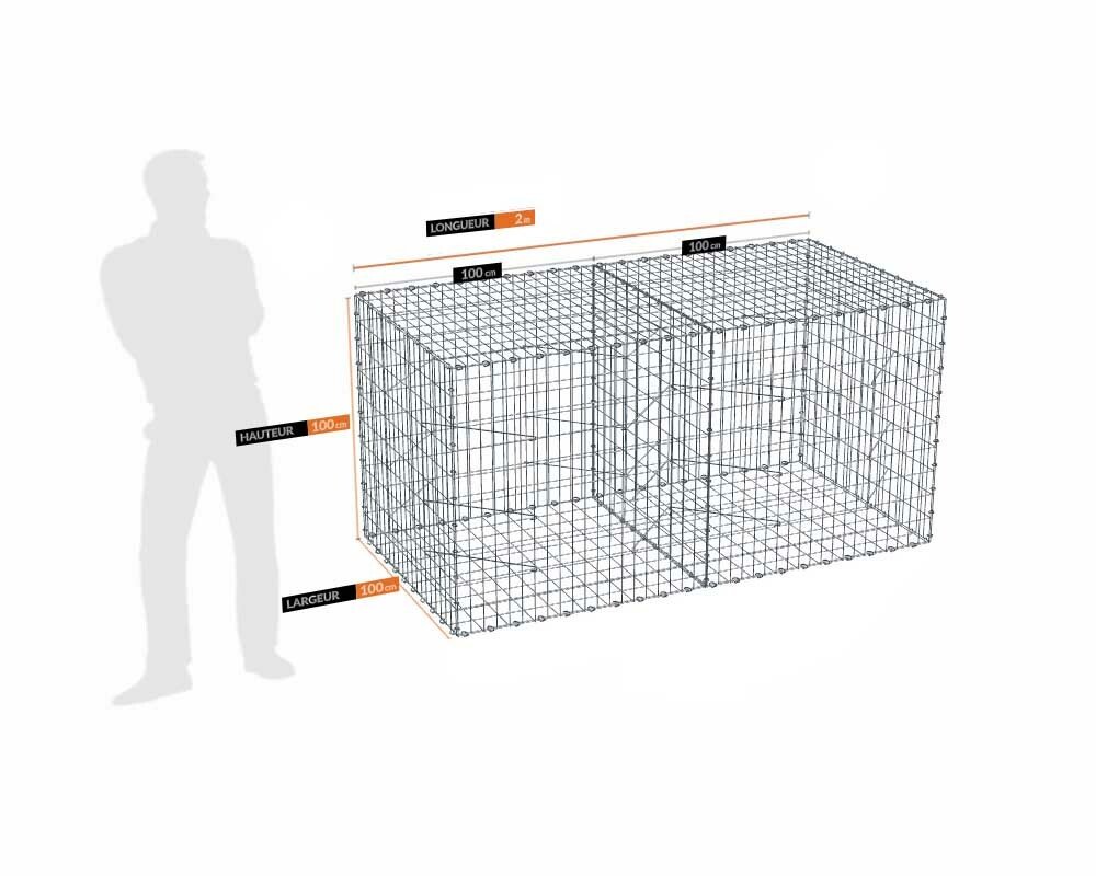 Kit gabion 2m de longueur, 100cm (H) x 100cm (L), pour clôture, assemblage agrafes, mailles 5 x 10 cm, grilles non visibles mailles 10 x 10 cm