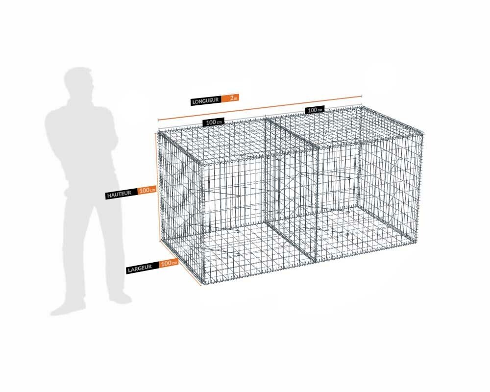 Kit gabion 2m de longueur, 100cm (H) x 100cm (L), pour clôture, assemblage spirales, mailles 5 x 10 cm, grilles non visibles mailles 10 x 10 cm