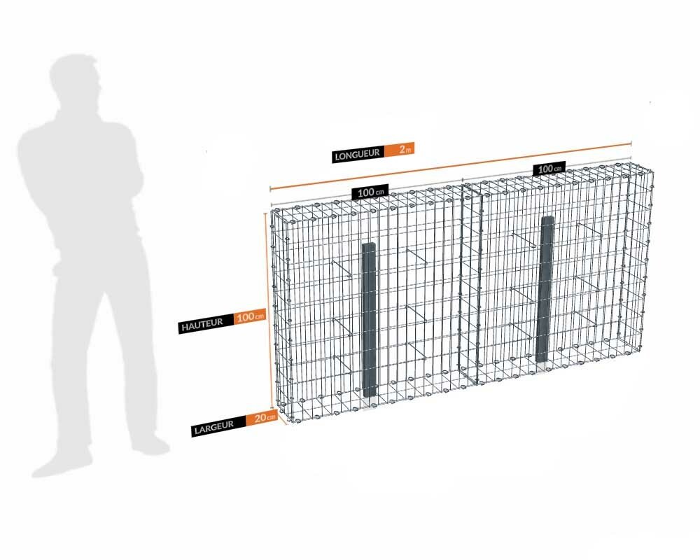 Kit gabion 2m de longueur, 100cm (H) x 20cm (L), pour clôture, assemblage agrafes, mailles 5 x 10 cm, avec poteaux raidisseurs à sceller
