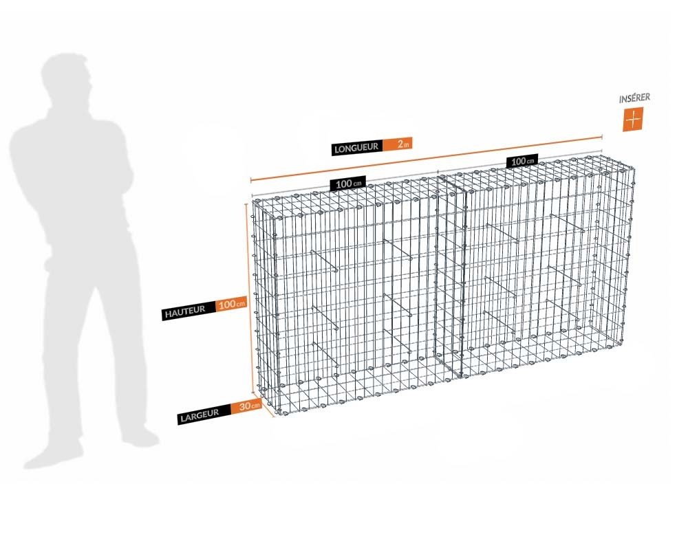 Kit gabion 100cm (H) x 30cm (L), pour clôture, assemblage agrafes, mailles 5 x 10 cm en fils de 4,5 mm sur les faces visibles. Mailles 10 x 10 cm en fils de 4 mm sur les faces invisibles .Kit de 2 m de longueur. Ces gabions sont livrés complets, sans les pierres, et à assembler.