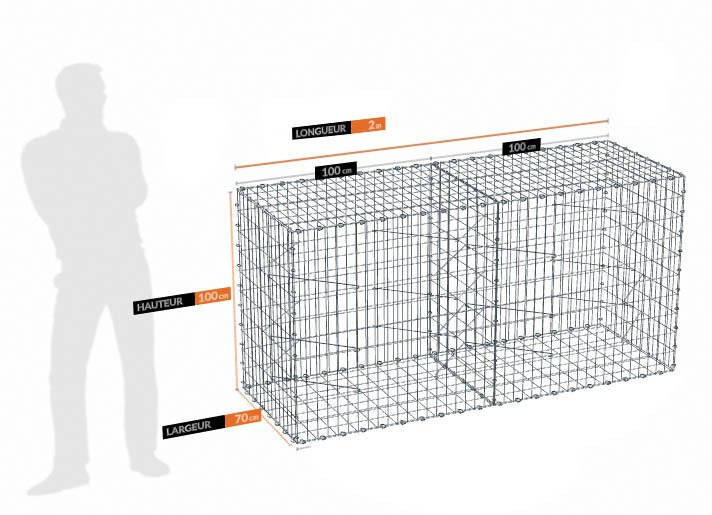 Kit gabion 100cm (H) x 70cm (L), pour clôture, assemblage agrafes, mailles 5 x 10 cm en fils de 4,5 mm sur les faces visibles. Mailles 10 x 10 cm en fils de 4 mm sur les faces invisibles .Kit de 2 m de longueur. Ces gabions sont livrés complets, sans les pierres, et à assembler.