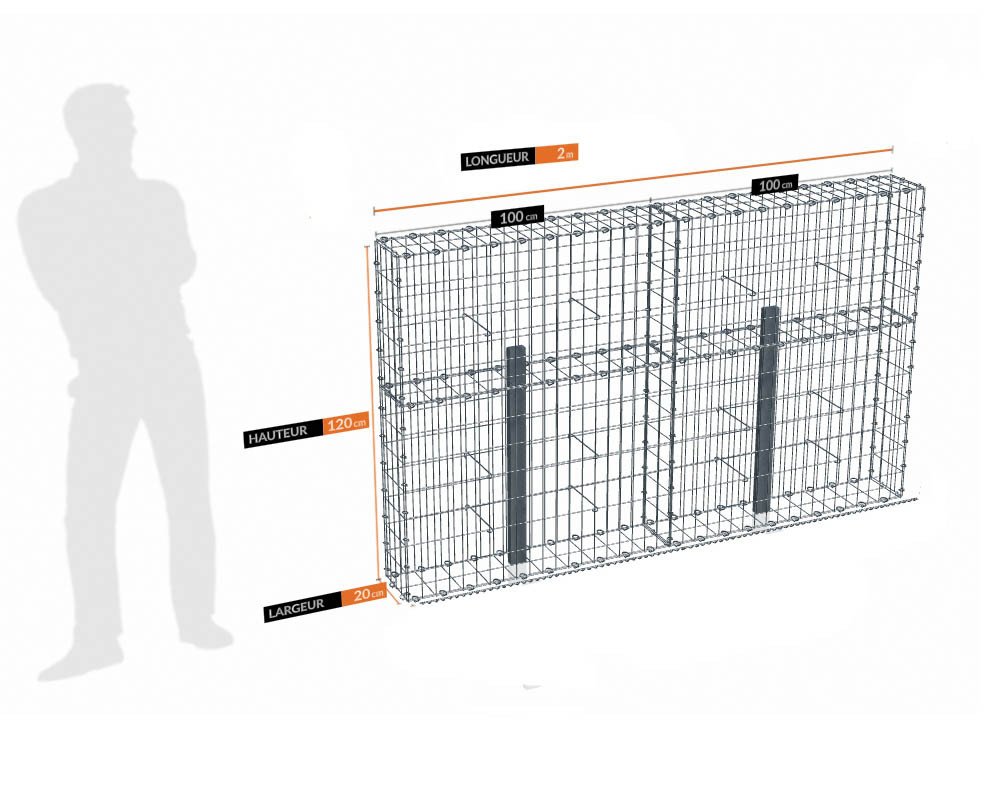 Kit gabion 2m de longueur, 120cm (H) x 20cm (L), pour clôture, assemblage agrafes, mailles 5 x 10 cm, avec poteaux raidisseurs à sceller