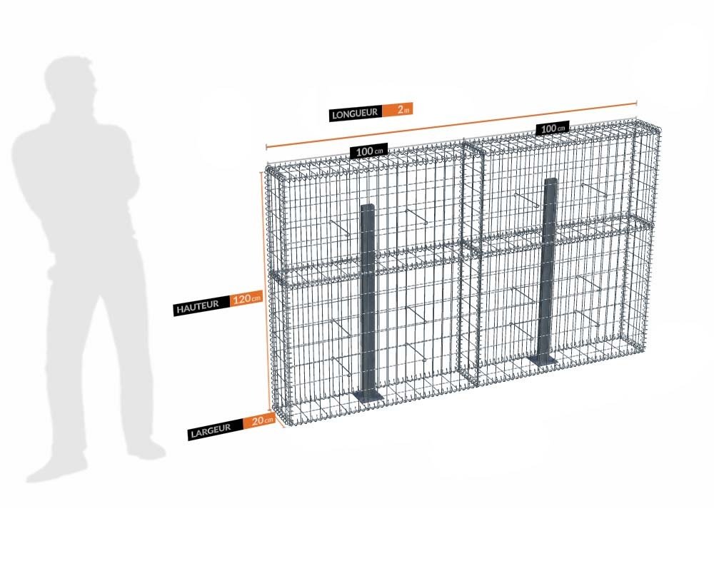 Kit gabion 120cm (H) x 20cm (L), pour clôture, assemblage spirales, mailles 5 x 10 cm, avec poteaux raidisseurs à visser. Kit de 2 m de longueur. Ces gabions sont livrés complets, sans les pierres, et à assembler. Mailles de 5 cm x 10 cm en fils de 4,5 mm sur les faces visibles. Mailles de 10 cm x 10 cm en fils de 4 mm sur les faces invisibles.