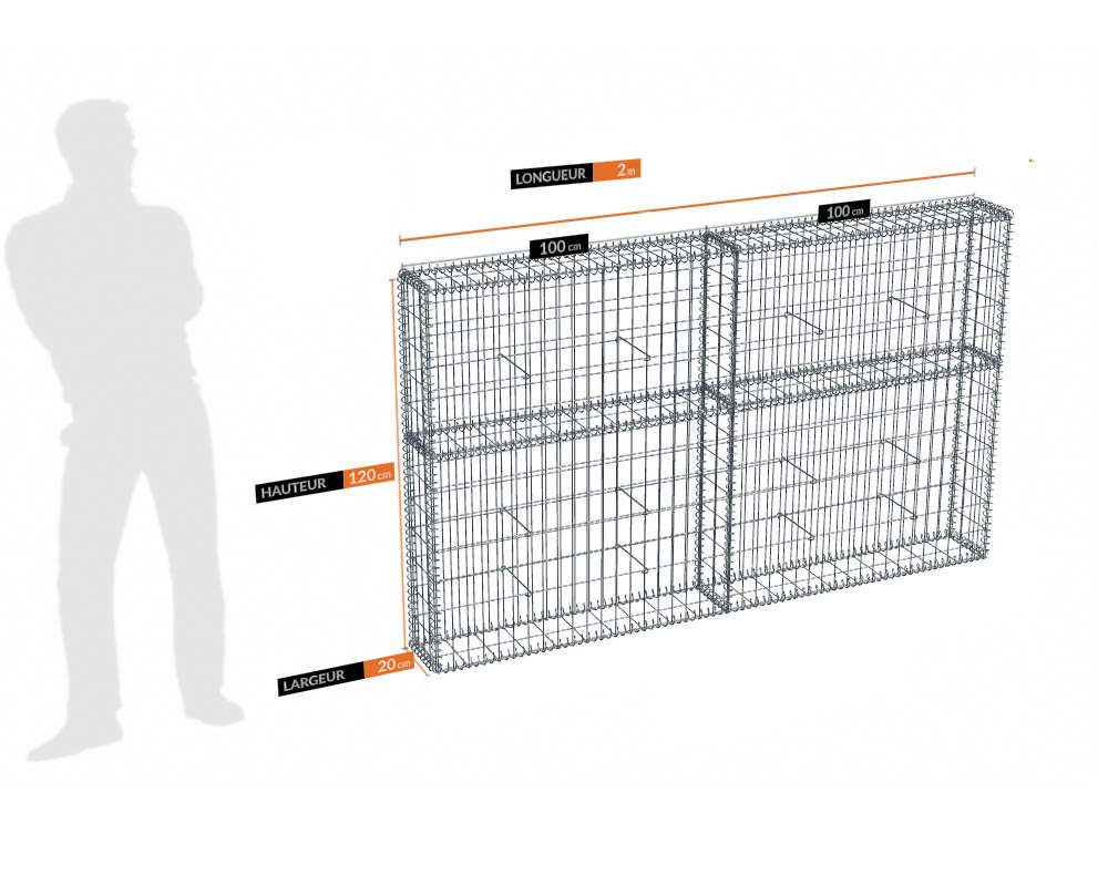 Kit gabion 120cm (H) x 20cm (L), pour clôture, assemblage spirales, mailles 5 x 10 cm en fils de 4,5 mm sur les faces visibles. Mailles 10 x 10 cm en fils de 4 mm sur les faces invisibles .Kit de 2 m de longueur. Ces gabions sont livrés complets, sans les pierres, et à assembler.