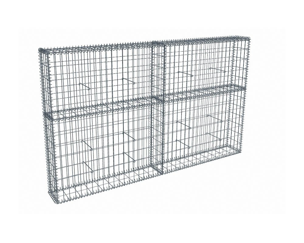 Il n'y a pas de doublement de cloisons. Seulement une cloison interne tous les mètres. Recoupe aisée avec une disqueuse ou une pince coupe-boulon. Ces gabions peuvent être superposés. Dans le cas de plusieurs rangs superposés, le couvercle du 1er rang servira de fond pour le 2eme rang, etc...