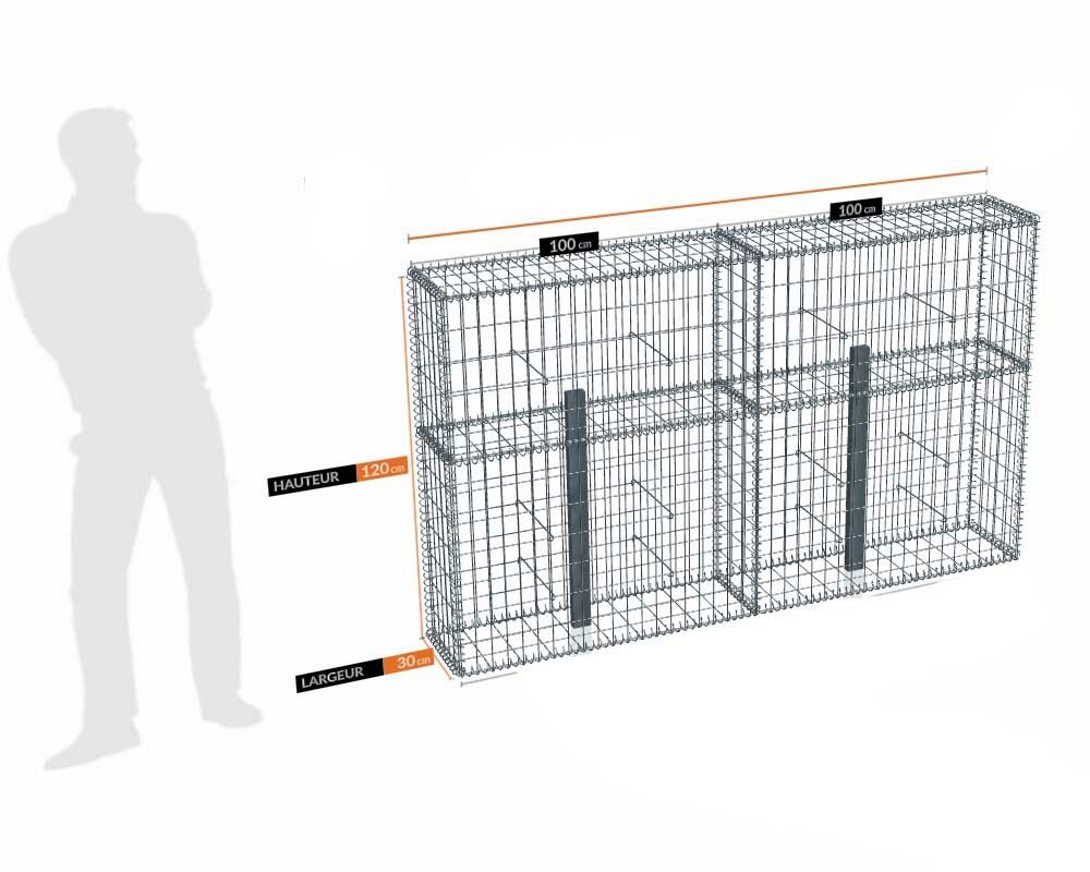 Kit gabion 120cm (H) x 30cm (L), pour clôture, assemblage spirales, mailles 5 x 10 cm, avec poteaux raidisseurs à sceller.Kit de 2 m de longueur. Ces gabions sont livrés complets, sans les pierres, et à assembler. Mailles de 5 cm x 10 cm en fils de 4,5 mm sur les faces visibles. Mailles de 10 cm x 10 cm en fils de 4 mm sur les faces invisibles.