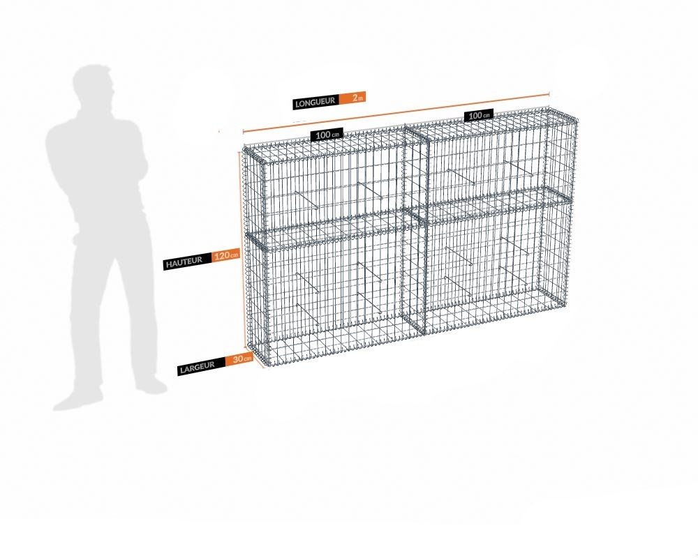 Kit gabion 120cm (H) x 30cm (L), pour clôture, assemblage spirales, mailles 5 x 10 cm en fils de 4,5 mm sur les faces visibles. Mailles 10 x 10 cm en fils de 4 mm sur les faces invisibles .Kit de 2 m de longueur. Ces gabions sont livrés complets, sans les pierres, et à assembler.