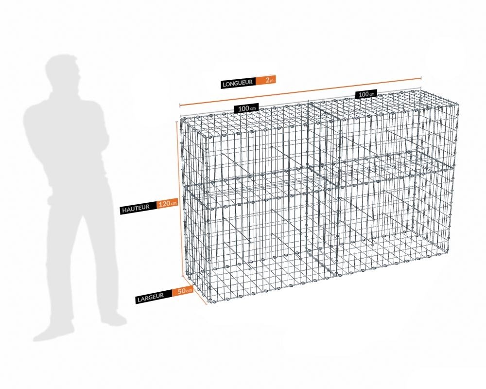 Kit gabion 2m de longueur, 120cm (H) x 50cm (L), pour clôture, assemblage agrafes, mailles 5 x 10 cm, grilles non visibles mailles 10 x 10 cm