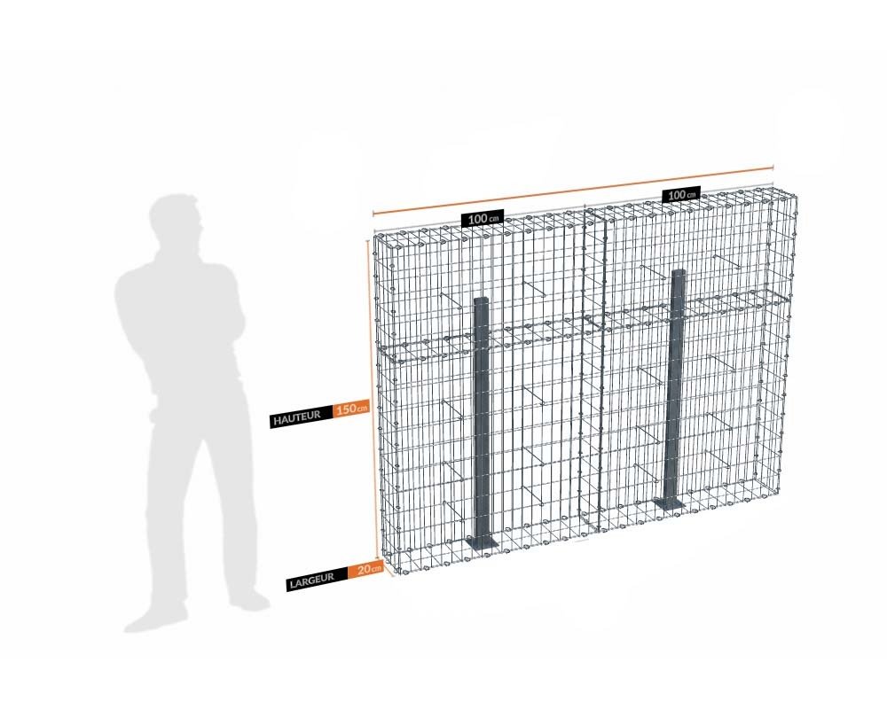 Pour les gabions clôture de 20 cm de largeur et d'une hauteur égale ou supérieure à 1 m, ainsi que pour tous les gabions clôture de largeur 30 cm et d'une hauteur égale ou supérieure à 1.20 m, il est impératif de mettre en place des poteaux raidisseurs ( à sceller ou à visser). Cela évitera tout risque de basculement accidentel. Si vous disposez déjà de poteaux raidisseurs, vous pouvez commander les kits sans poteaux.