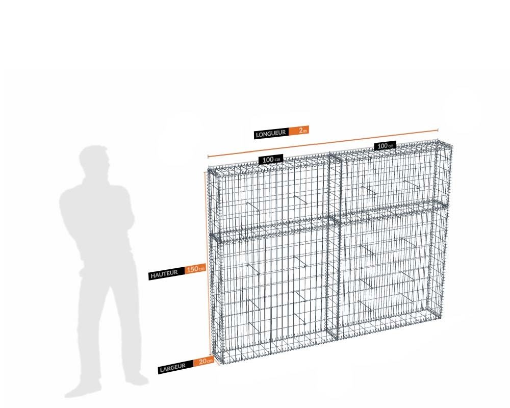 Kit gabion 150cm (H) x 20cm (L), pour clôture, assemblage spirales, mailles 5 x 10 cm en fils de 4,5 mm sur les faces visibles. Mailles 10 x 10 cm en fils de 4 mm sur les faces invisibles .Kit de 2 m de longueur. Ces gabions sont livrés complets, sans les pierres, et à assembler.