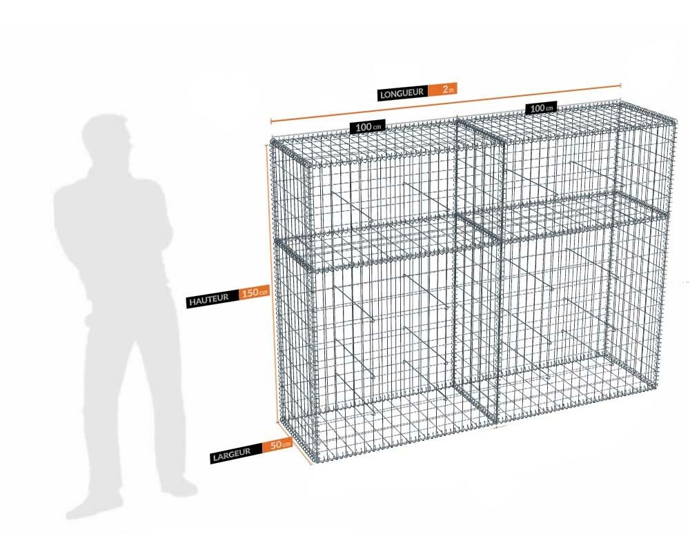 Kit gabion 150cm (H) x 50cm (L), pour clôture, assemblage spirales, mailles 5 x 10 cm en fils de 4,5 mm sur les faces visibles. Mailles 10 x 10 cm en fils de 4 mm sur les faces invisibles .Kit de 2 m de longueur. Ces gabions sont livrés complets, sans les pierres, et à assembler.