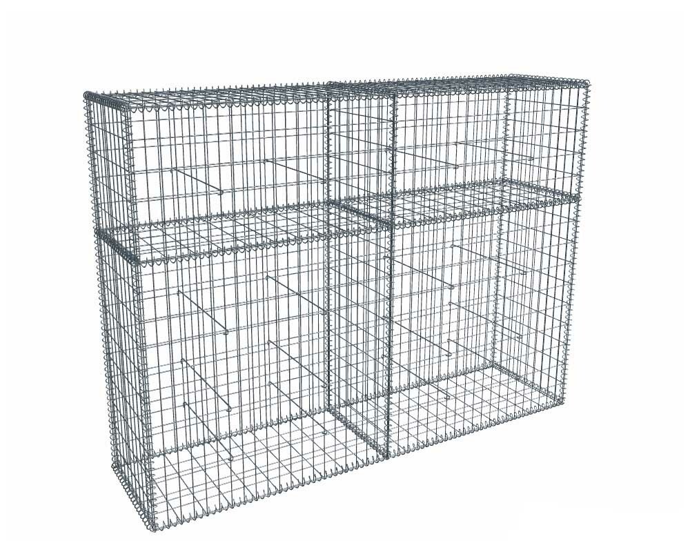 Il n'y a pas de doublement de cloisons. Seulement une cloison interne tous les mètres. Recoupe aisée avec une disqueuse ou une pince coupe-boulon. Ces gabions peuvent être superposés. Dans le cas de plusieurs rangs superposés, le couvercle du 1er rang servira de fond pour le 2eme rang, etc...