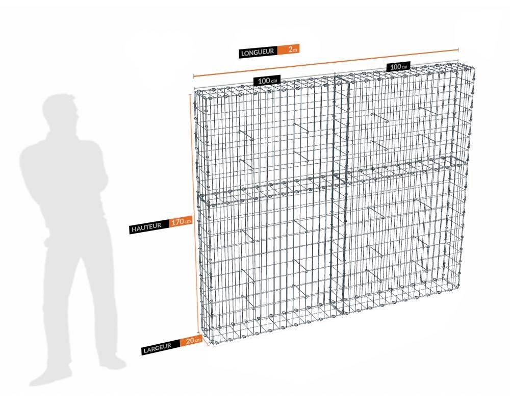 Kit gabion 170cm (H) x 20cm (L), pour clôture, assemblage agrafes, mailles 5 x 10 cm en fils de 4,5 mm sur les faces visibles. Mailles 10 x 10 cm en fils de 4 mm sur les faces invisibles .Kit de 2 m de longueur. Ces gabions sont livrés complets, sans les pierres, et à assembler.