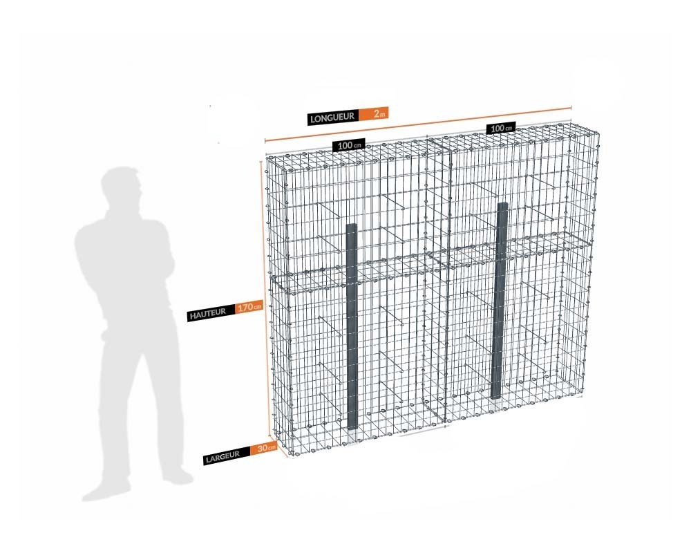 Kit gabion 2m de longueur, 170cm (H) x 30cm (L), pour clôture, assemblage agrafes, mailles 5 x 10 cm, avec poteaux raidisseurs à sceller
