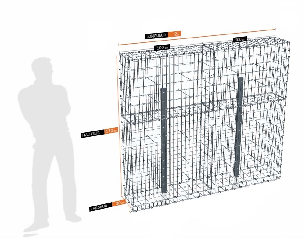 Kit gabion 170cm (H) x 30cm (L), pour clôture, assemblage agrafes, mailles 5 x 10 cm en fils de 4,5 mm sur les faces visibles. Mailles 10 x 10 cm en fils de 4 mm sur les faces invisibles .Kit de 2 m de longueur. Ces gabions sont livrés complets, sans les pierres, et à assembler.