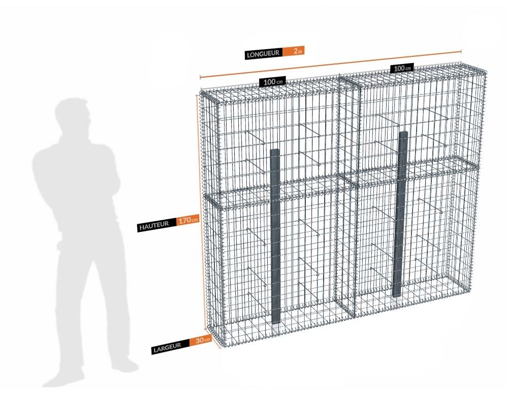Kit gabion 170cm (H) x 30cm (L), pour clôture, assemblage spirales, mailles 5 x 10 cm, avec poteaux raidisseurs à sceller.Kit de 2 m de longueur. Ces gabions sont livrés complets, sans les pierres, et à assembler. Mailles de 5 cm x 10 cm en fils de 4,5 mm sur les faces visibles. Mailles de 10 cm x 10 cm en fils de 4 mm sur les faces invisibles.