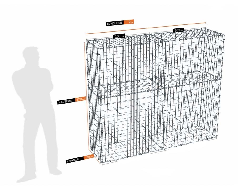 Kit gabion 170cm (H) x 50cm (L), pour clôture, assemblage agrafes, mailles 5 x 10 cm en fils de 4,5 mm sur les faces visibles. Mailles 10 x 10 cm en fils de 4 mm sur les faces invisibles .Kit de 2 m de longueur. Ces gabions sont livrés complets, sans les pierres, et à assembler.