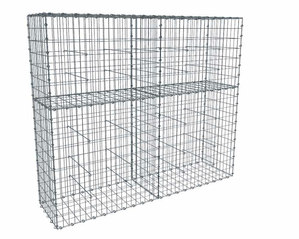 Il n'y a pas de doublement de cloisons. Seulement une cloison interne tous les mètres. Recoupe aisée avec une disqueuse ou une pince coupe-boulon. Ces gabions peuvent être superposés. Dans le cas de plusieurs rangs superposés, le couvercle du 1er rang servira de fond pour le 2eme rang, etc...