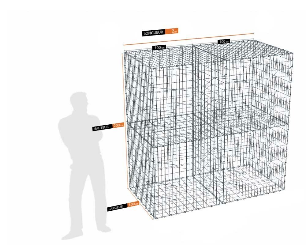 Ces gabions sont des modules de 2 ml, composés de panneaux de 2 m de long. Pour les kits de moins de 6 m de longueur, les côtés sont composés de panneaux de 1 m de longueur.