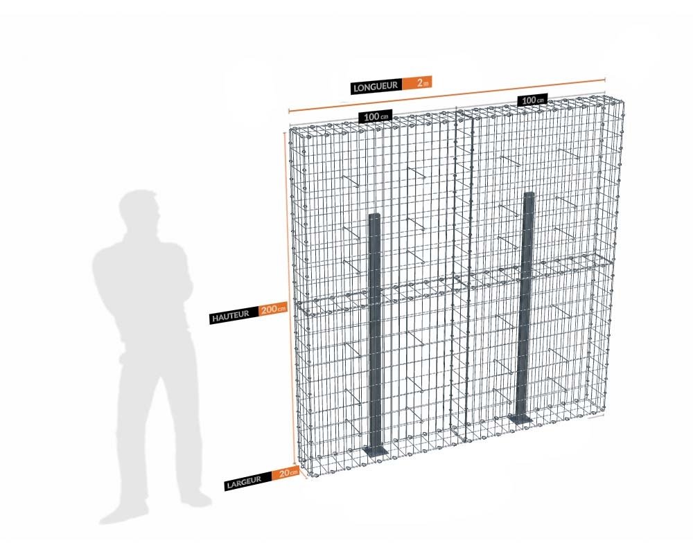 Kit gabion 200cm (H) x 20cm (L), pour clôture, assemblage agrafes, mailles 5 x 10 cm, avec poteaux raidisseurs à visser. Kit de 2 m de longueur. Ces gabions sont livrés complets, sans les pierres, et à assembler. Mailles de 5 cm x 10 cm en fils de 4,5 mm sur les faces visibles. Mailles de 10 cm x 10 cm en fils de 4 mm sur les faces invisibles.