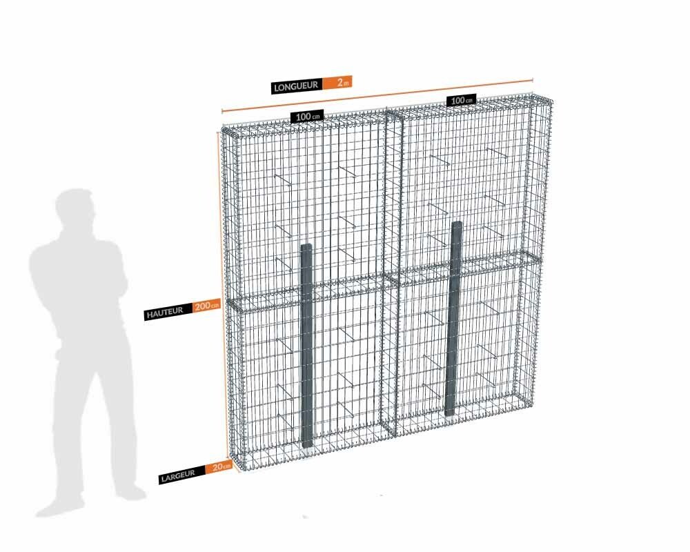 Kit gabion 200cm (H) x 20cm (L), pour clôture, assemblage spirales, mailles 5 x 10 cm, avec poteaux raidisseurs à sceller.Kit de 2 m de longueur. Ces gabions sont livrés complets, sans les pierres, et à assembler. Mailles de 5 cm x 10 cm en fils de 4,5 mm sur les faces visibles. Mailles de 10 cm x 10 cm en fils de 4 mm sur les faces invisibles.