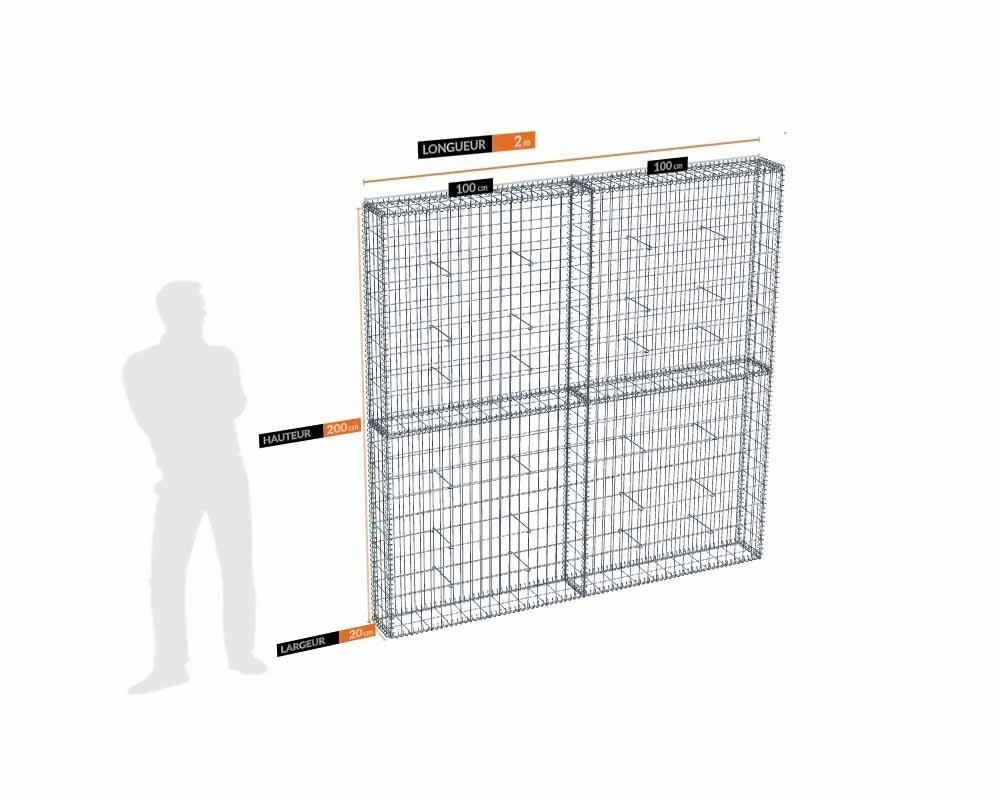 Kit gabion 200cm (H) x 20cm (L), pour clôture, assemblage spirales, mailles 5 x 10 cm en fils de 4,5 mm sur les faces visibles. Mailles 10 x 10 cm en fils de 4 mm sur les faces invisibles .Kit de 2 m de longueur. Ces gabions sont livrés complets, sans les pierres, et à assembler.