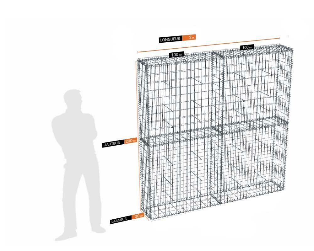Kit gabion 200cm (H) x 30cm (L), pour clôture, assemblage spirales, mailles 5 x 10 cm en fils de 4,5 mm sur les faces visibles. Mailles 10 x 10 cm en fils de 4 mm sur les faces invisibles .Kit de 2 m de longueur. Ces gabions sont livrés complets, sans les pierres, et à assembler.