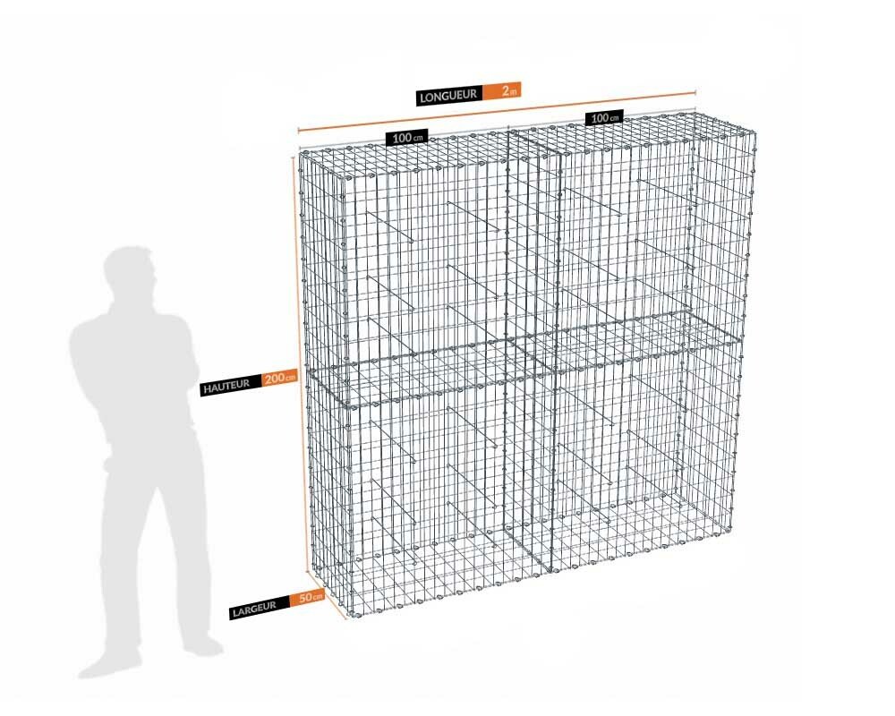 Kit gabion 200cm (H) x 50cm (L), pour clôture, assemblage agrafes, mailles 5 x 10 cm en fils de 4,5 mm sur les faces visibles. Mailles 10 x 10 cm en fils de 4 mm sur les faces invisibles .Kit de 2 m de longueur. Ces gabions sont livrés complets, sans les pierres, et à assembler.