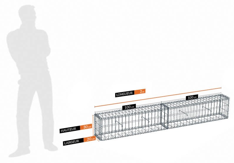 Kit gabion 30cm (H) x 20cm (L), pour clôture, assemblage spirales, mailles 5 x 10 cm en fils de 4,5 mm sur les faces visibles. Mailles 10 x 10 cm en fils de 4 mm sur les faces invisibles .Kit de 2 m de longueur. Ces gabions sont livrés complets, sans les pierres, et à assembler.