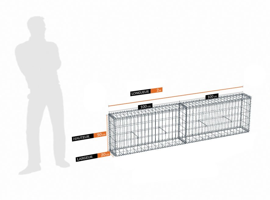 Kit gabion 50cm (H) x 20cm (L), pour clôture, assemblage spirales, mailles 5 x 10 cm en fils de 4,5 mm sur les faces visibles. Mailles 10 x 10 cm en fils de 4 mm sur les faces invisibles .Kit de 2 m de longueur. Ces gabions sont livrés complets, sans les pierres, et à assembler.
