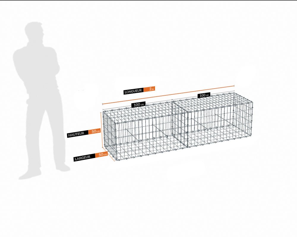 Kit gabion 2m de longueur, 50cm (H) x 50cm (L), pour clôture, assemblage agrafes, mailles 5 x 10 cm, grilles non visibles mailles 10 x 10 cm