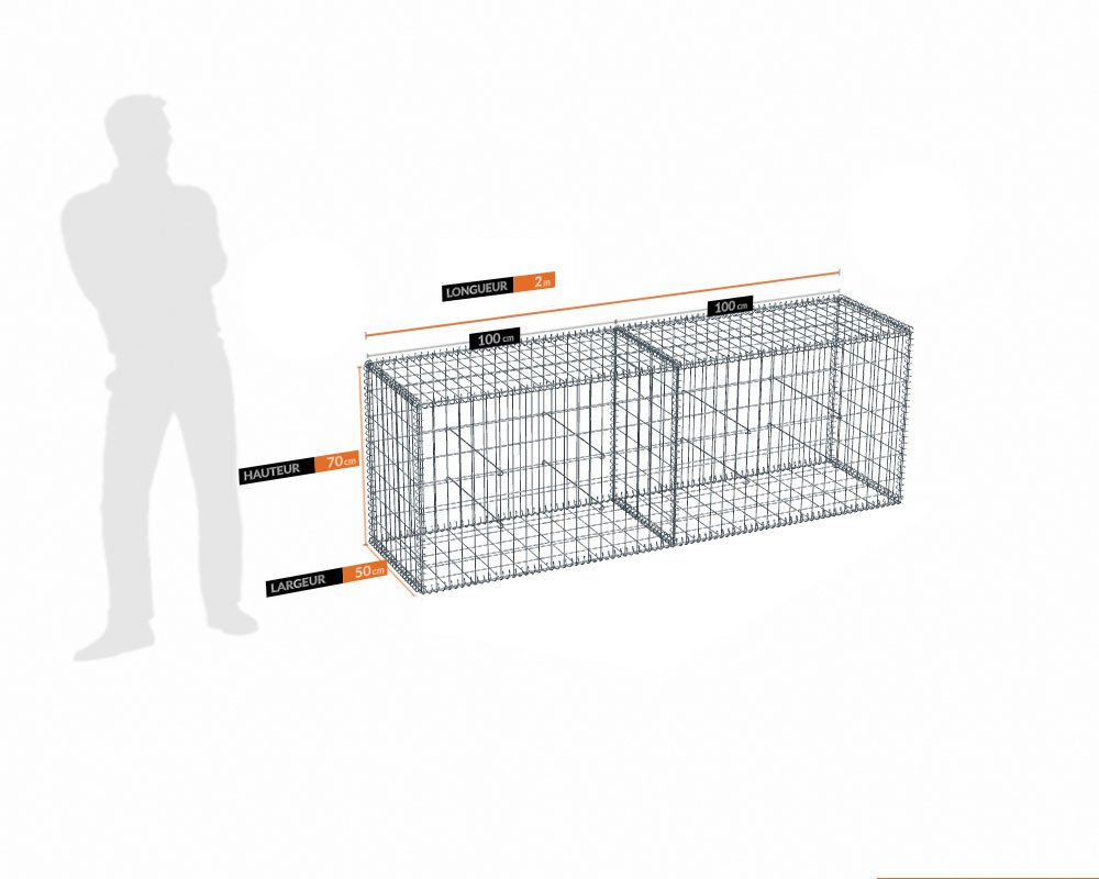 Kit gabion 2m de longueur, 70cm (H) x 50cm (L), pour clôture, assemblage spirales, mailles 5 x 10 cm, grilles non visibles mailles 10 x 10 cm