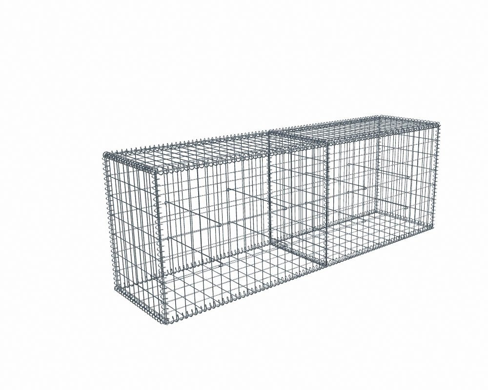 Il n'y a pas de doublement de cloisons. Seulement une cloison interne tous les mètres. Recoupe aisée avec une disqueuse ou une pince coupe-boulon. Ces gabions peuvent être superposés. Dans le cas de plusieurs rangs superposés, le couvercle du 1er rang servira de fond pour le 2eme rang, etc...