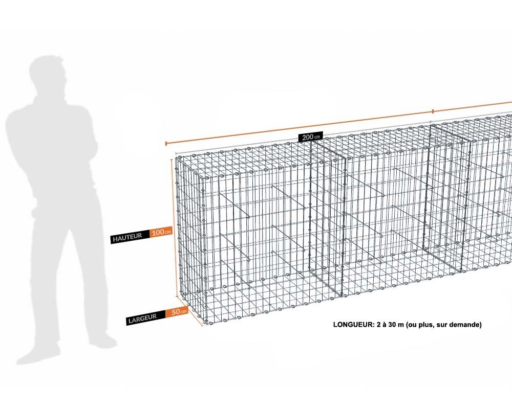 Kit gabion 100cm (H) x 50cm (L), pour clôture, assemblage agrafes, mailles 5 x 10 cm en fils de 4,5 mm sur les faces visibles. Mailles 10 x 10 cm en fils de 4 mm sur les faces invisibles .Kit de 30 m de longueur. Ces gabions sont livrés complets, sans les pierres, et à assembler.