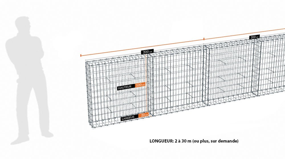 Kit gabion 100cm (H) x 20cm (L), pour clôture, assemblage agrafes, mailles 5 x 10 cm en fils de 4,5 mm sur les faces visibles. Mailles 10 x 10 cm en fils de 4 mm sur les faces invisibles .Kit de 4 m de longueur. Ces gabions sont livrés complets, sans les pierres, et à assembler.
