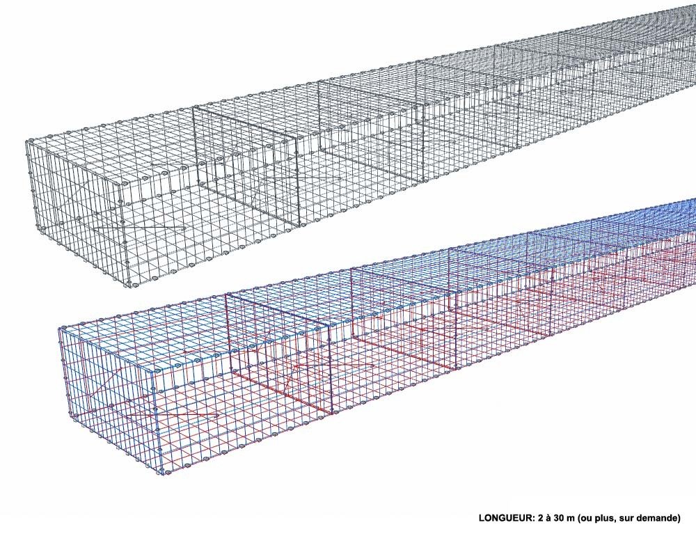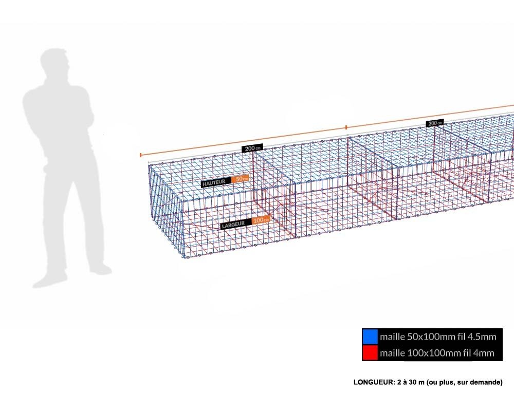 Ces gabions sont des modules de 2 ml, composés de panneaux de 2 m de long. Pour les kits de moins de 6 m de longueur, les côtés sont composés de panneaux de 1 m de longueur.