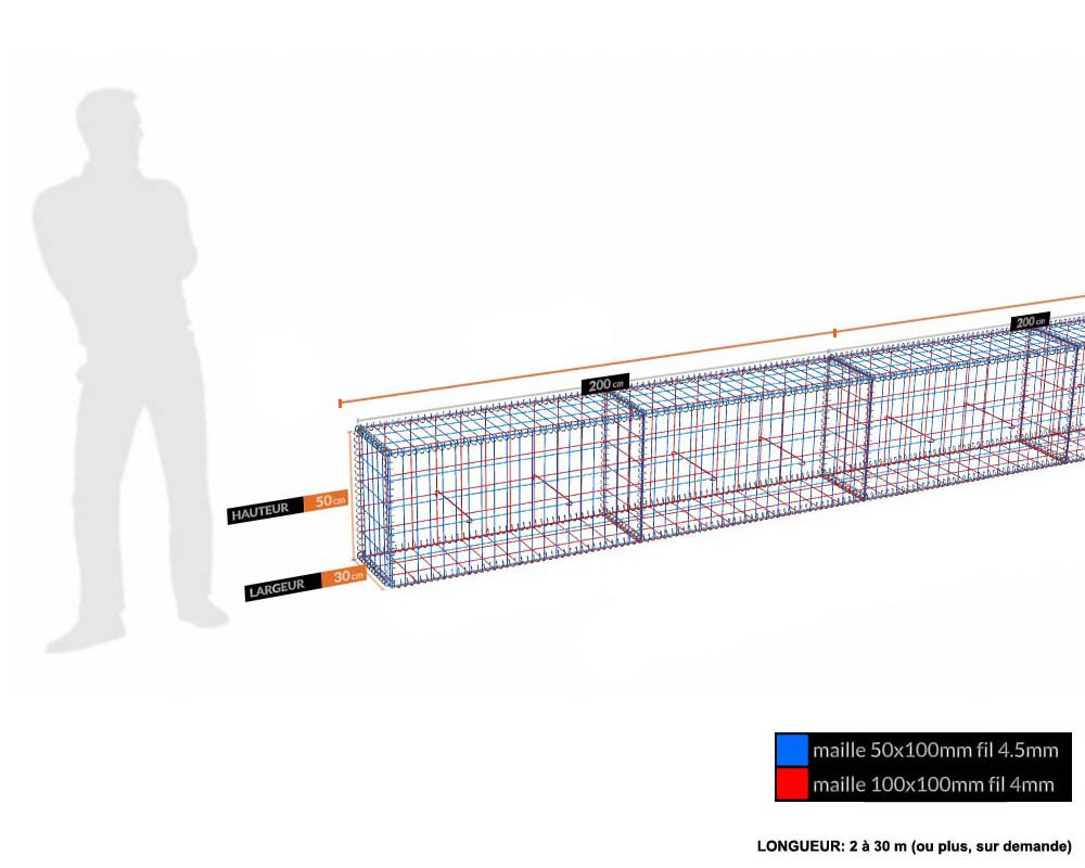 Ces gabions sont des modules de 2 ml, composés de panneaux de 2 m de long. Pour les kits de moins de 6 m de longueur, les côtés sont composés de panneaux de 1 m de longueur.