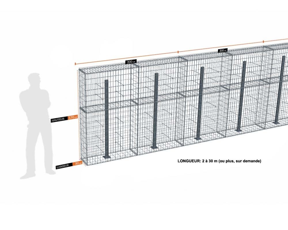 Kit gabion 170cm (H) x 30cm (L), pour clôture, assemblage spirales, mailles 5 x 10 cm, avec poteaux raidisseurs à visser. Kit de 6 m de longueur. Ces gabions sont livrés complets, sans les pierres, et à assembler. Mailles de 5 cm x 10 cm en fils de 4,5 mm sur les faces visibles. Mailles de 10 cm x 10 cm en fils de 4 mm sur les faces invisibles.