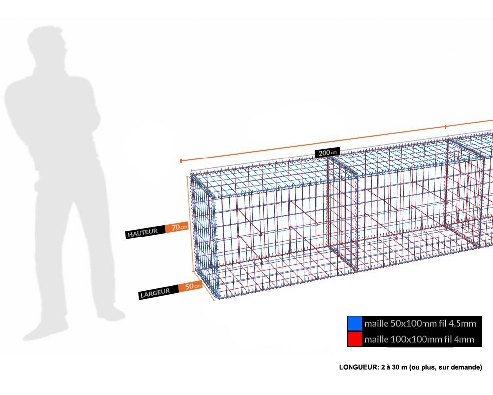 Ces gabions sont des modules de 2 ml, composés de panneaux de 2 m de long. Pour les kits de moins de 6 m de longueur, les côtés sont composés de panneaux de 1 m de longueur.