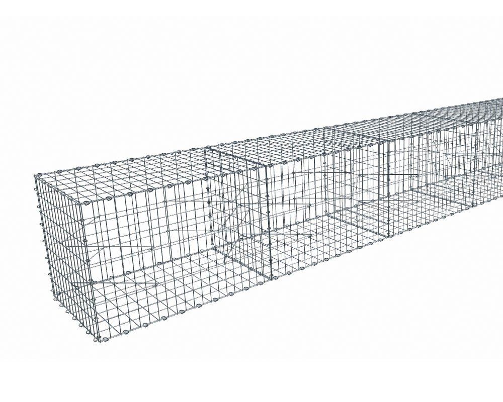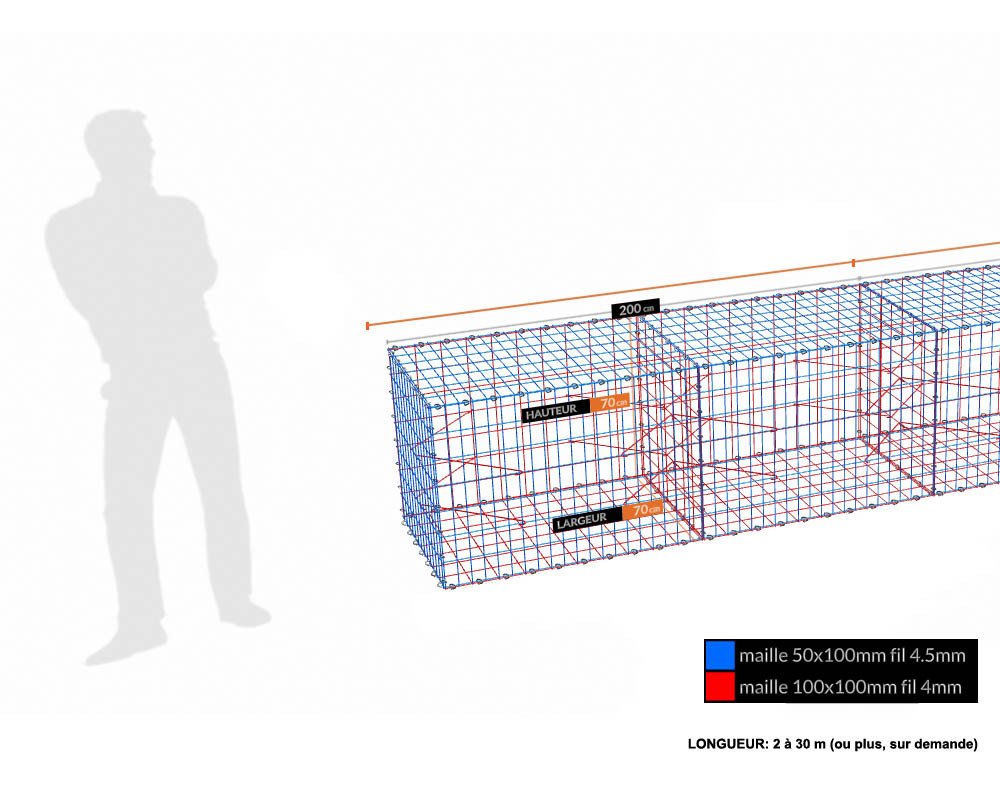 Ces gabions sont des modules de 2 ml, composés de panneaux de 2 m de long. Pour les kits de moins de 6 m de longueur, les côtés sont composés de panneaux de 1 m de longueur.