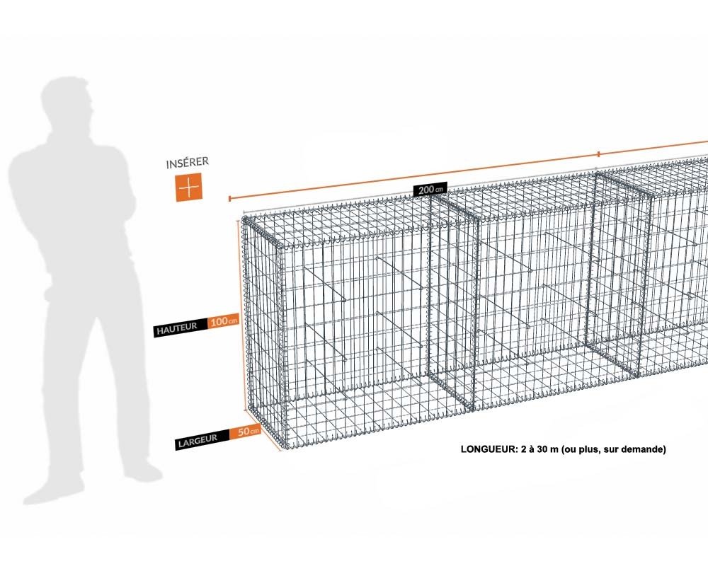 Kit gabion 100cm (H) x 50cm (L), pour clôture, assemblage spirales, mailles 5 x 10 cm en fils de 4,5 mm sur les faces visibles. Mailles 10 x 10 cm en fils de 4 mm sur les faces invisibles .Kit de 8 m de longueur. Ces gabions sont livrés complets, sans les pierres, et à assembler.